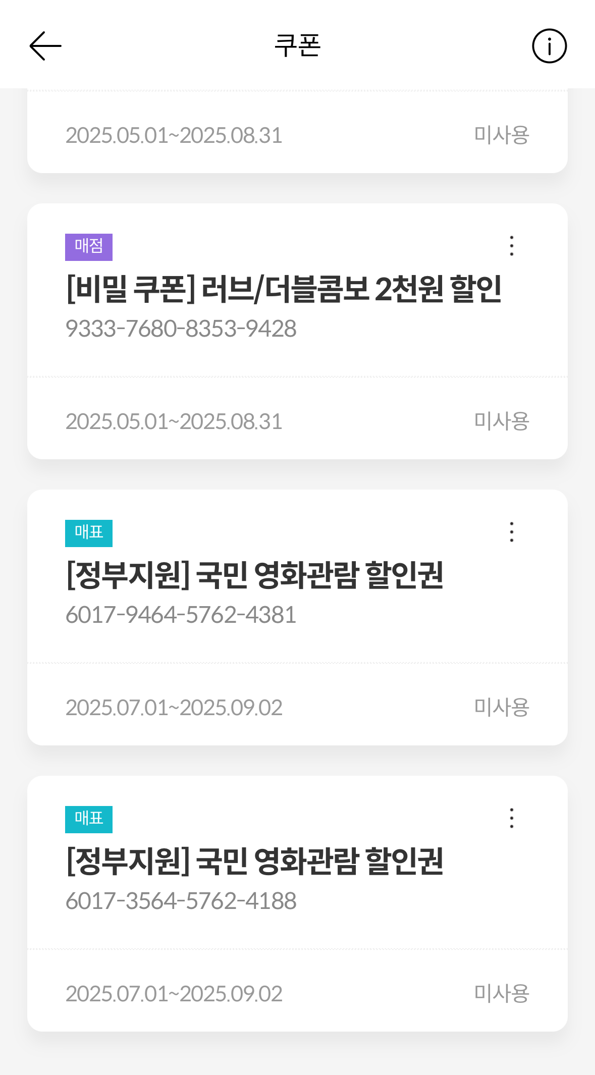 오른쪽 상단 메뉴 버튼에서 쿠폰함에 가보면 [정부지원] 국민 영화관람 할인권 쿠폰 2장이 들어와있다.