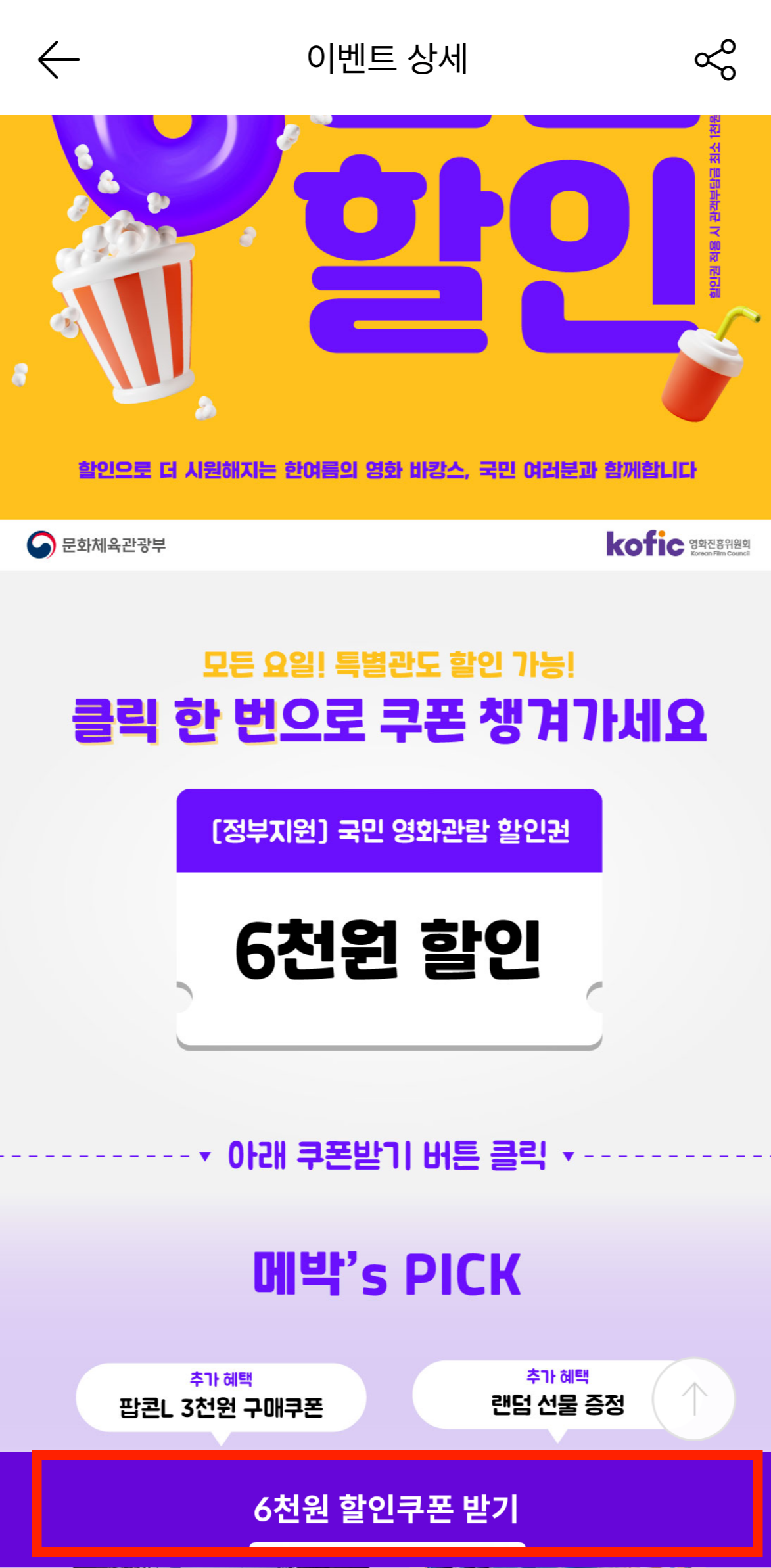 정부에서 발표한 영화 입장권 6,000원 할인쿠폰이 오늘 오전 10시부터 선착순으로 배포되기 시작했는데요. 예상대로 엄청난 접속자가 몰리면서 각 영화관 사이트와 앱에 대혼란이 일어났어요. 하지만 여러 시도 끝에 메가박스 앱을 통해 쿠폰을 성공적으로 받을 수 있었던 경험을 공유해드릴게요.