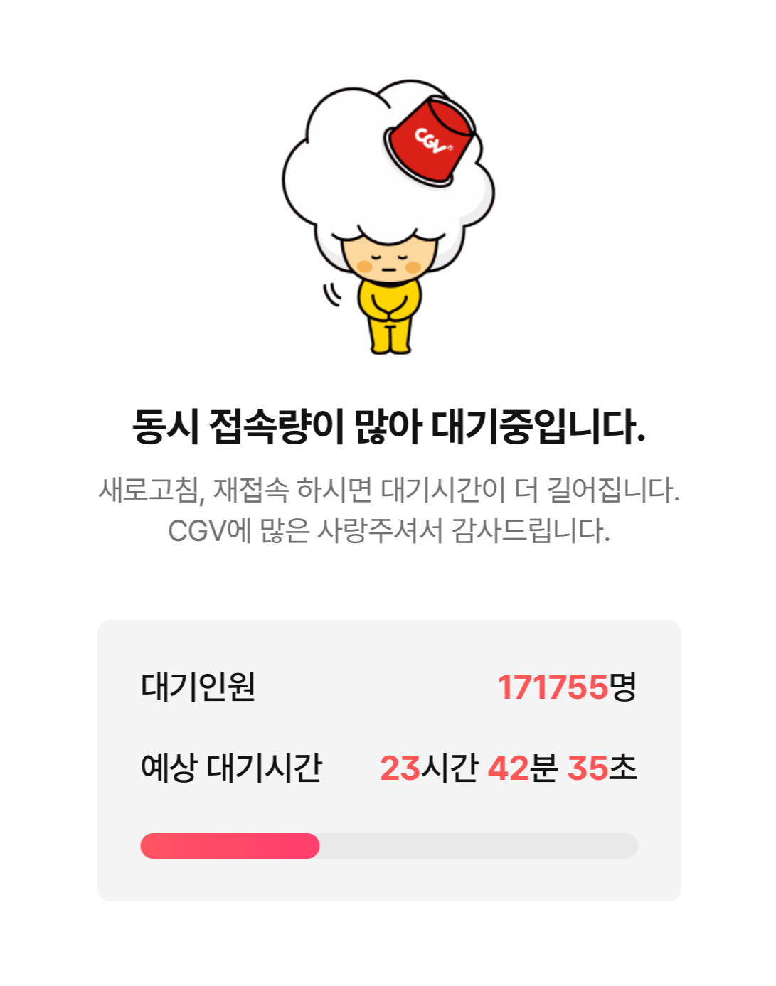 영화표 6,000원 할인 쿠폰을 손에 넣으려 CGV 앱과 홈페이지에 접속한 순간, 상상을 초월하는 대기열과 오류 메시지에 좌절감을 맛보셨나요? 저도 오늘 아침 10시부터 CGV 이벤트 페이지 앞에 진을