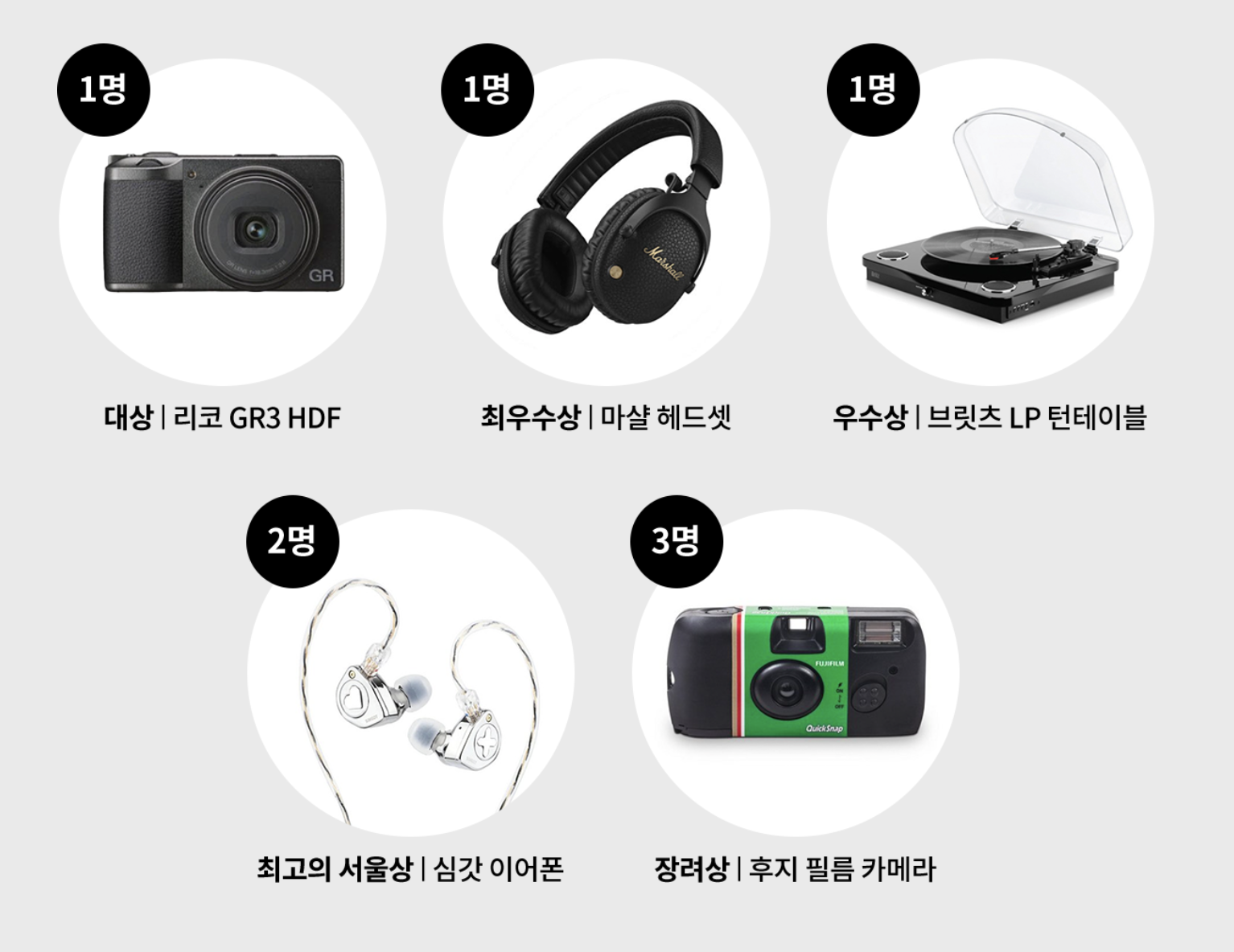 수상자들에게는 특별한 선물이 마련되어 있습니다. 대상 수상자 1명에게는 리코 카메라 GR# HDF가, 최우수상 1명에게는 마샬 헤드셋이 제공됩니다. 우수상 수상자는 브릿즈 LP 턴테이블을, 최고의 서울상 2명은 심갓 이어폰을, 장려상 3명은 후지 필름 카메라를 받게 됩니다. 더욱 특별한 것은 수상작품들이 서울 내 다양한 옥외광고판에 전시될 예정이라는 점입니다.