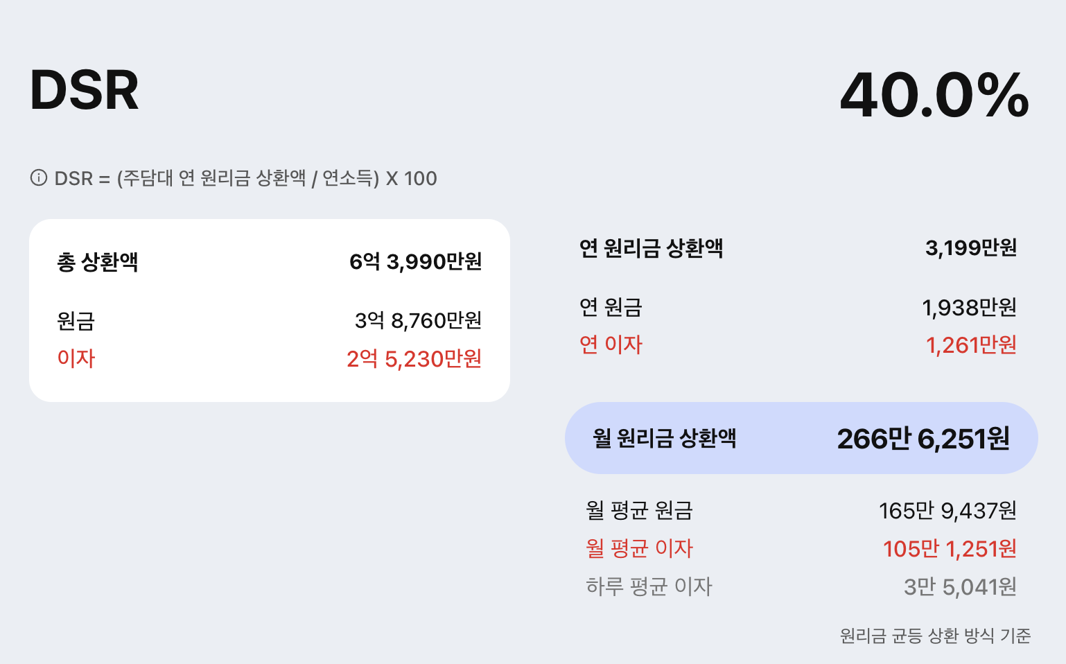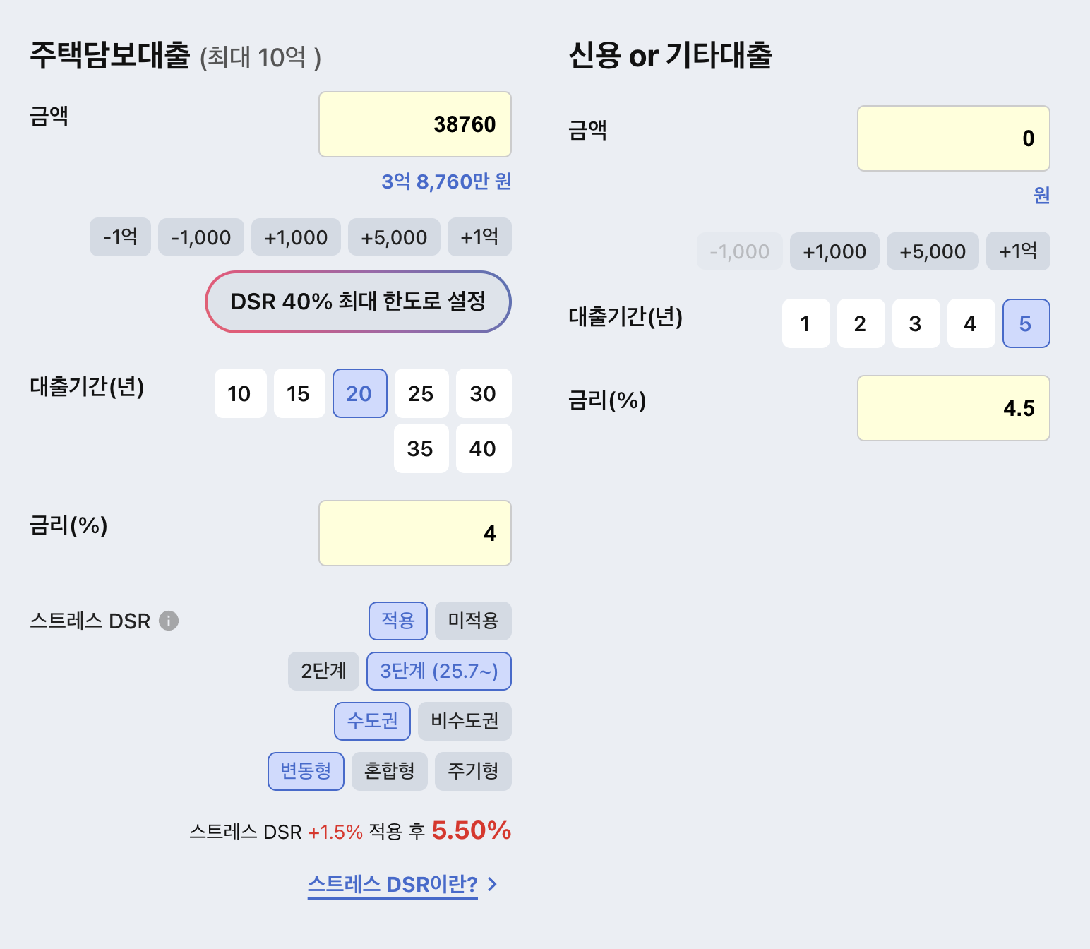 스트레스 DSR은 실제 대출 금리에 가상의 스트레스 금리를 더해 상환 능력을 평가하는 제도입니다. 예를 들어 현재 대출 금리가 4%라면, 여기에 스트레스 금리 1.5%를 더한 5.5%로 월 상환액을 계산해 대출 한도를 산정합니다.