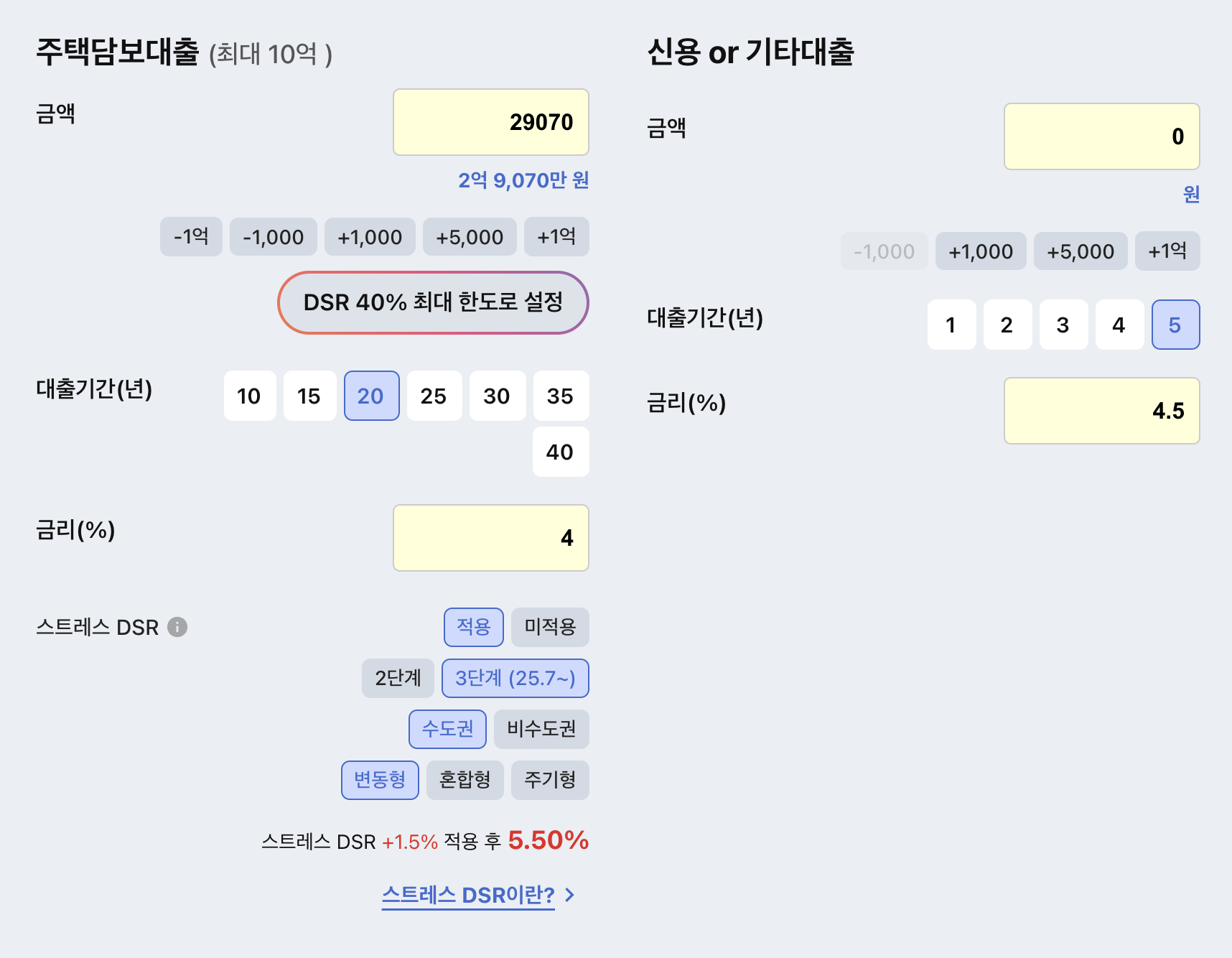 DSR계산기 사이트에서 대출 한도를 시뮬레이션 해볼 수 있습니다.