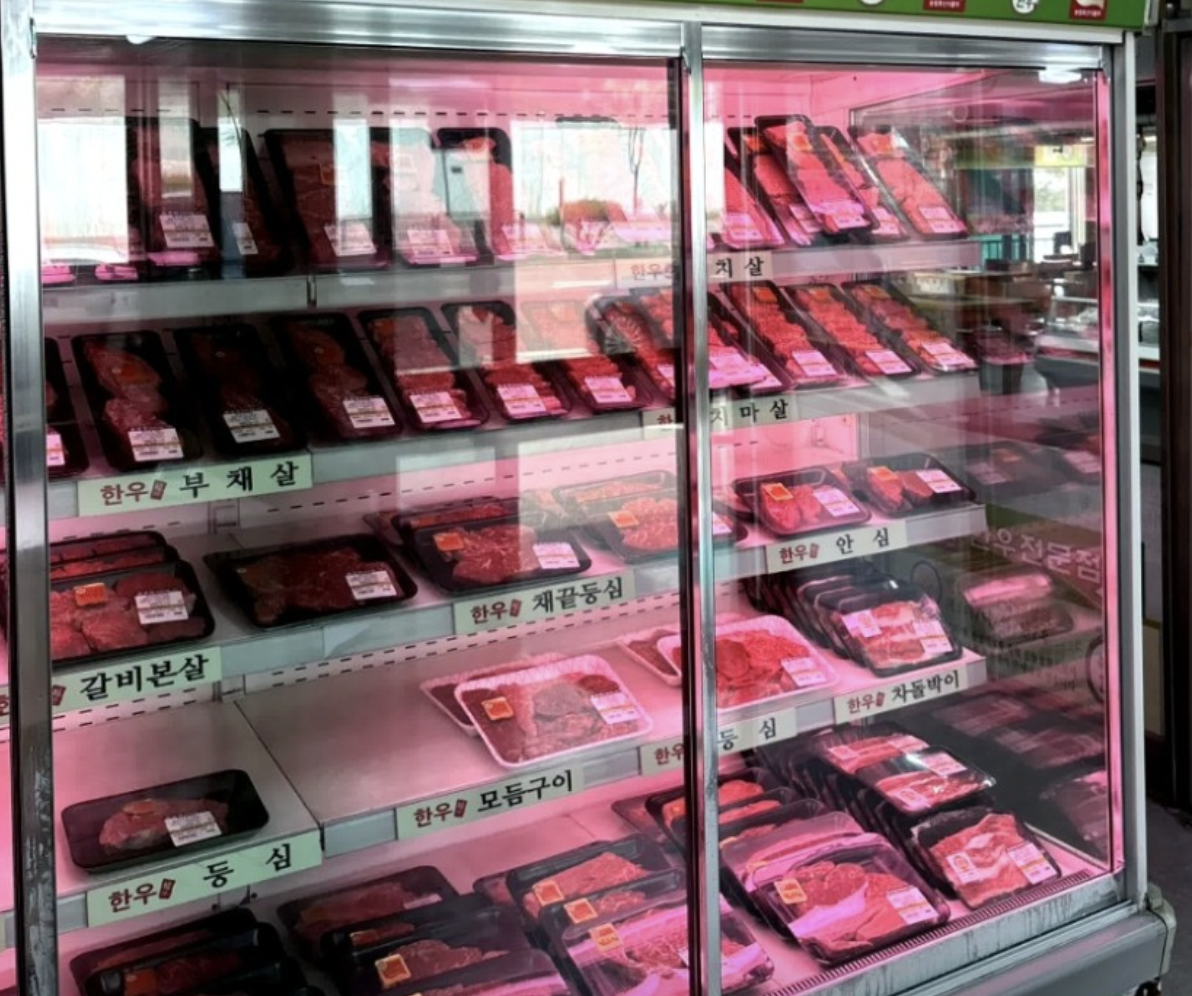 한우만내고향축산은 정육식당 시스템으로 운영되어 원하는 부위의 고기를 직접 선택해서 구워 먹을 수 있습니다. 매장 입구에는 1++ 등급 한우가 부위별로 진열된 대형 쇼케이스가 있어 신선도를 직접 확인할 수 있습니다. 현재 10년 전 가격으로 인하된 상태로, 등심은 100g당 14,500원, 차돌박이는 100g당 9,900원에 판매되고 있습니다.