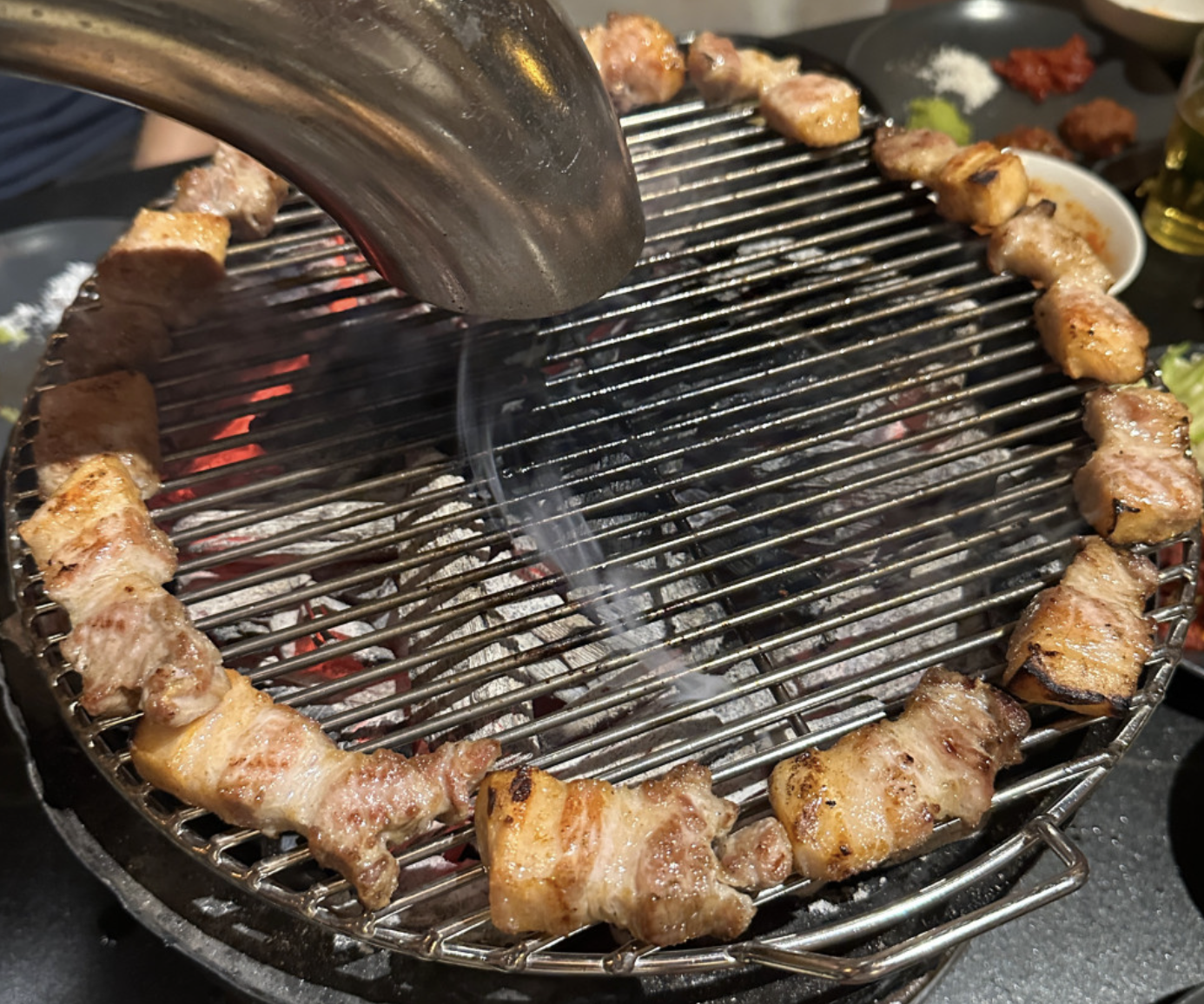 특히 숯불과 고기 사이의 거리 조절도 정교합니다. 너무 가까우면 타버리고, 너무 멀면 육즙이 빠져나가죠. 마치 '불과 고기의 거리학'을 연구한 듯한 정밀함으로 고기 맛이 가장 풍부하게 살아나는 최적의 간격을 유지합니다.