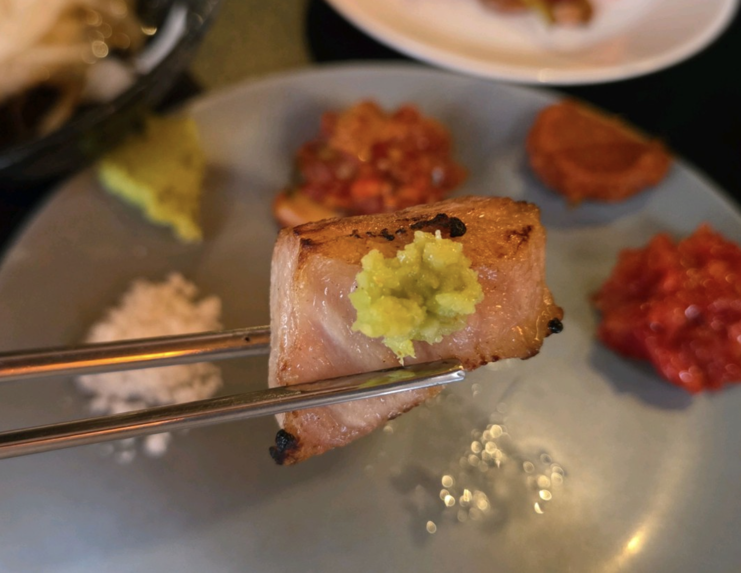 굵은 소금 한 점은 고기의 단맛을 더욱 또렷하게 해주고, 고추냉이 한 점은 지방의 느끼함을 정리해 입안을 다시 깔끔하게 만들어줍니다. 양파절임은 은은한 산미를, 새우젓은 짠맛과 감칠맛의 절묘한 조화를 통해 고기의 완성도를 한층 높여줍니다.