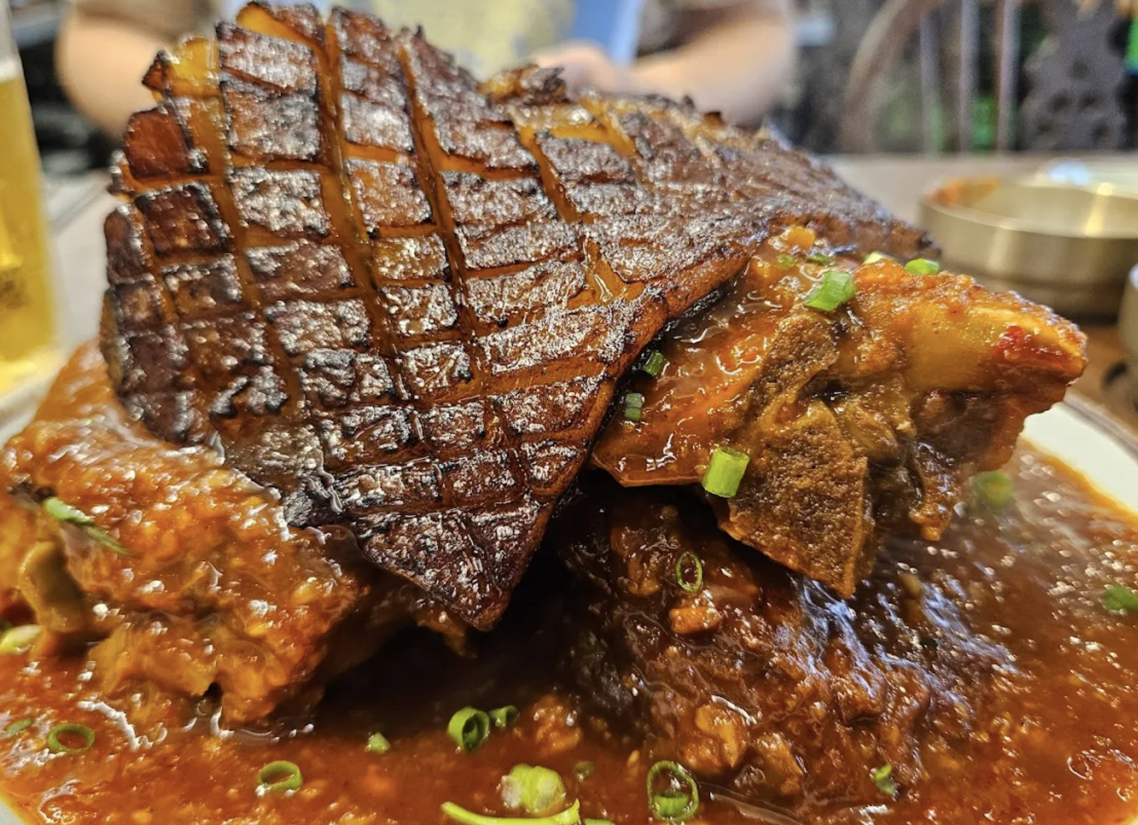 함수라의 통껍데기 뼈찜은 최신 수비드 기법을 활용해 장시간 저온에서 정밀하게 조리됩니다. 이 과정을 통해 돼지등뼈는 포크로 살짝 건드리기만 해도 살이 분리될 정도로 부드러워지죠. 그 위에 정성스럽게 삶아낸 통돼지껍데기를 얹어 완성하는데, 마치 푸근한 이불을 덮어놓은 듯한 비주얼이 인상적입니다.