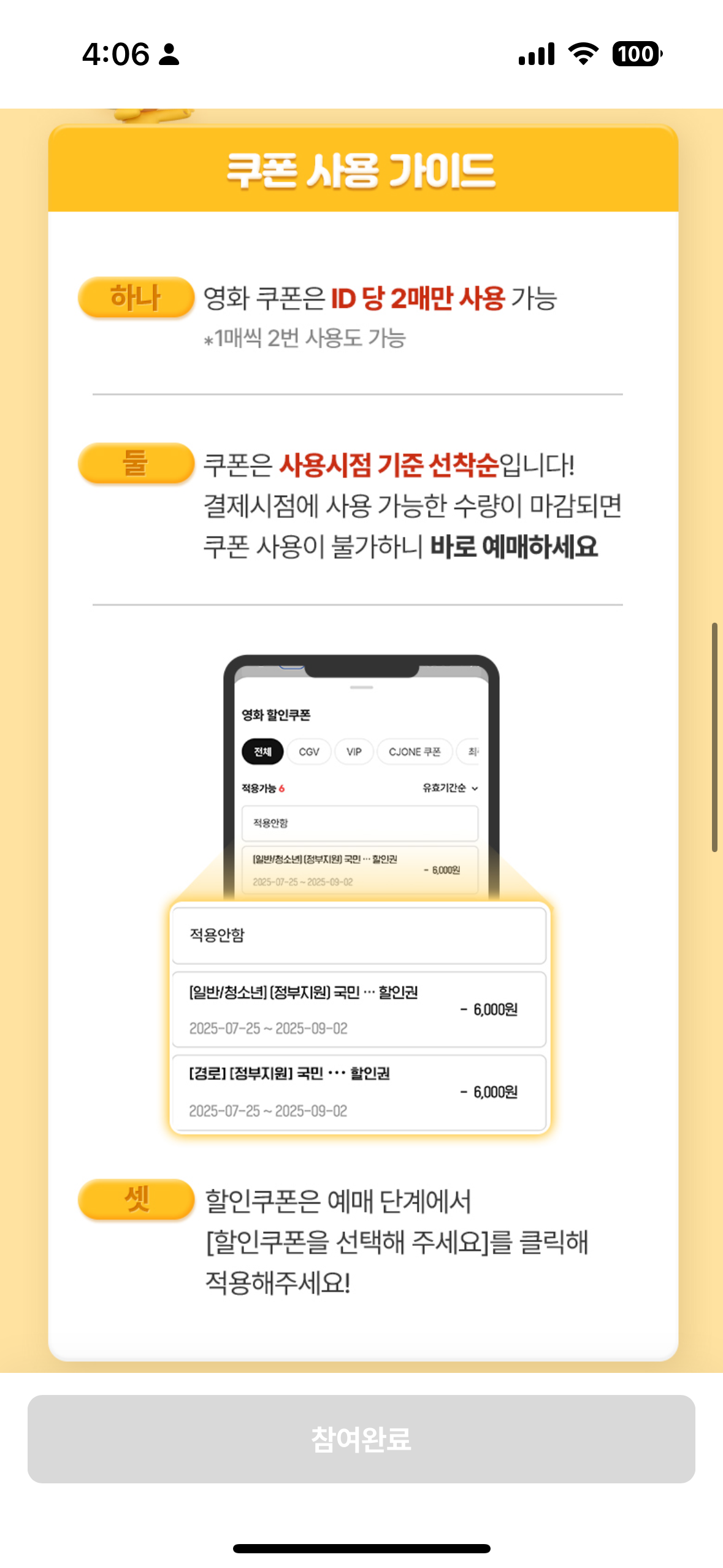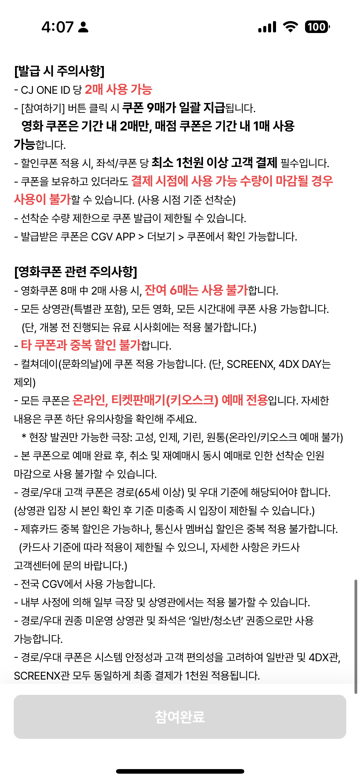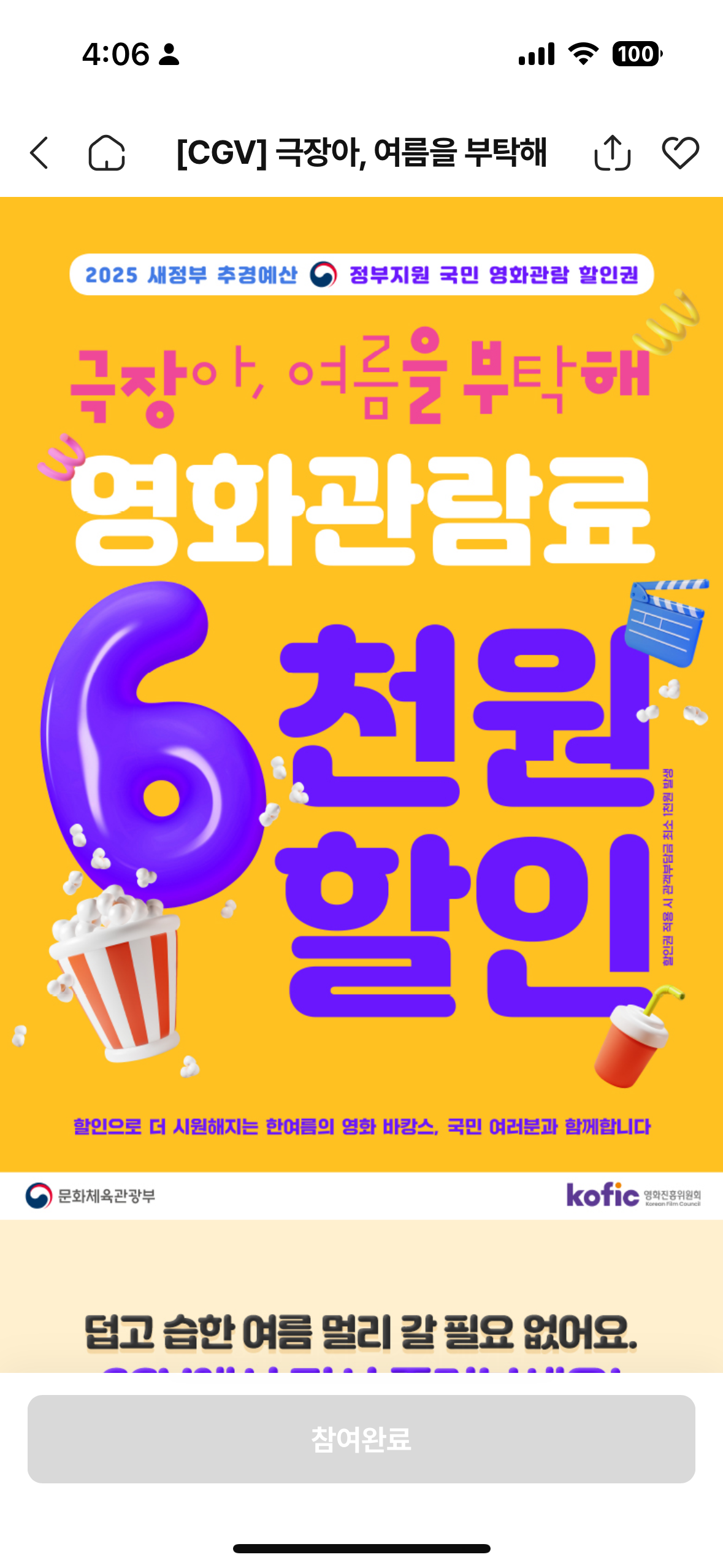 CGV 국민 영화관람 할인권은 9월 2일까지, 요일 제한 없이 사용 가능하며 조조·경로·장애인 할인과 중복 적용됩니다. 서버 과부하로 고군분투 중이신 분들은 이 후기를 참고해 인내심을 가지고 끈기 있게 도전해 보세요. 분명히 ‘할인 쿠폰 발급 완료’라는 단어를 마주하실 수 있을 겁니다!
