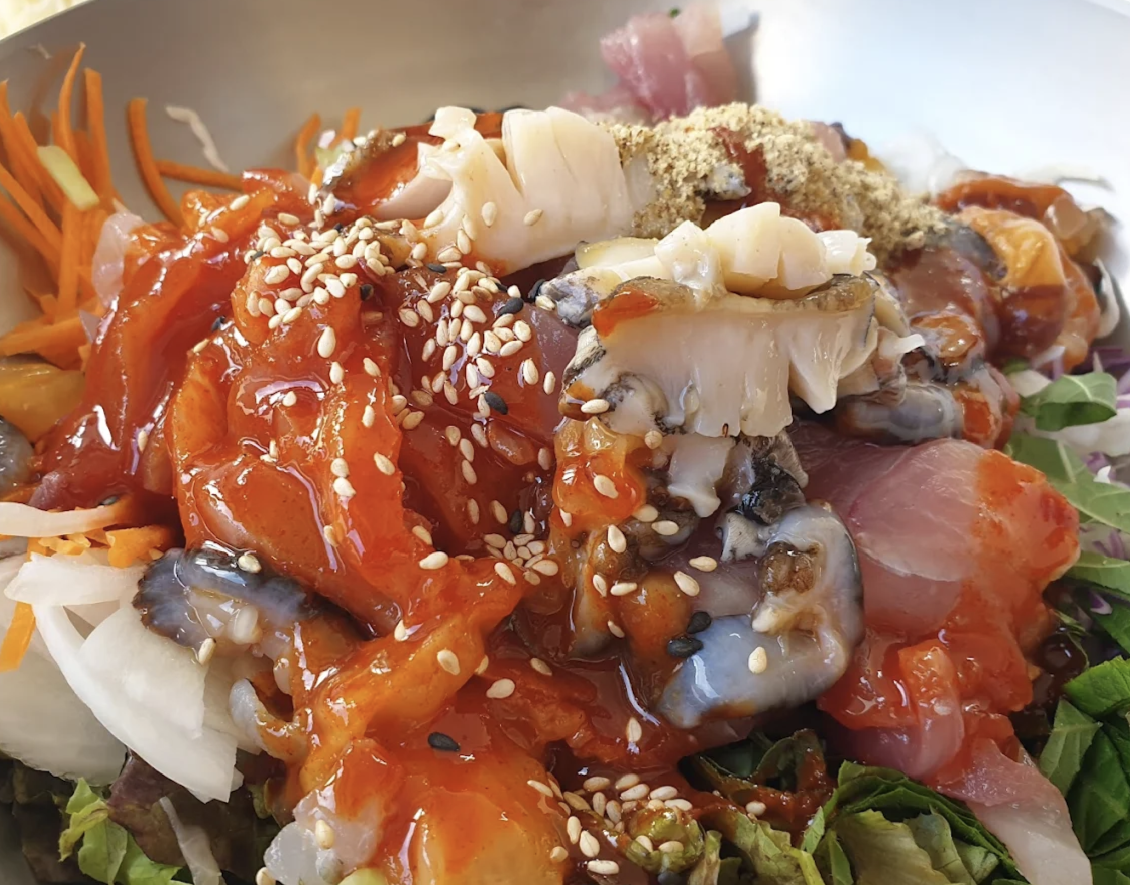 이 특별한 물회에는 전복, 멍게, 해삼, 오징어, 그리고 그날그날 잡힌 싱싱한 잡어까지 총 5가지 해산물이 풍성하게 들어갑니다. 여기에 해초로 만든 면이 더해져 한 그릇만으로도 충분히 든든한 한 끼 식사가 되죠.