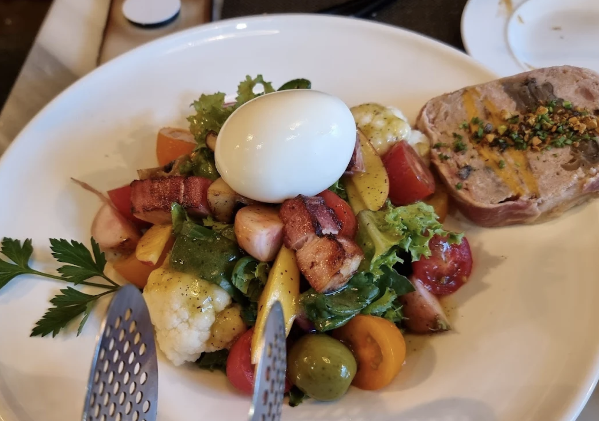 신선하게 준비된 계절 채소들 사이로 풍미가 진한 테린과 바삭하게 구워진 베이컨이 완벽한 밸런스를 만들어냅니다. 특히 테린의 부드러우면서도 깊은 맛과 베이컨의 고소한 크런치가 어우러지는 순간, 프랑스 리옹 지방의 정통 비스트로에 앉아 있는 듯한 착각을 불러일으킵니다.