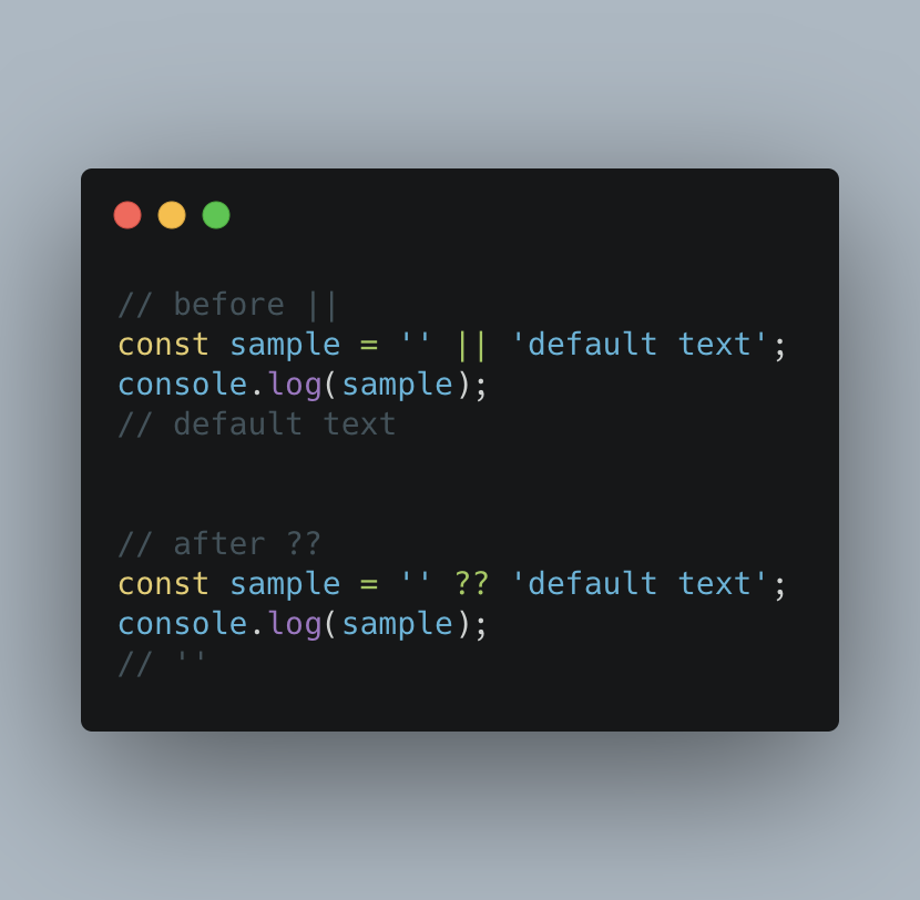 예전에는 논리 연산자인 || 를 사용해 좌항의 피연산자가 false로 평가되는 Falsy 값 일 경우에 우항의 피연산자를 반환했다. 만약 폴시값인 0이나 빈값인 '' 도 기본값으로 유효하다면 의도하지 않은 사이드이펙트를 발생시킬 수 있다.