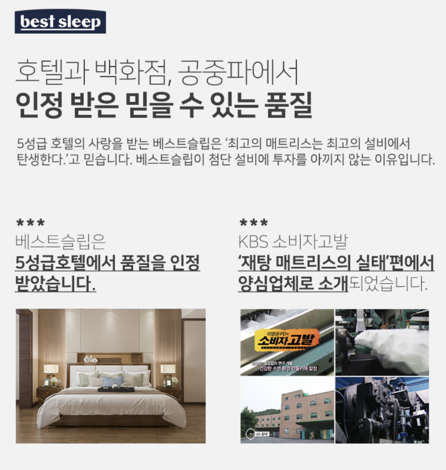 한국인이 선호하는 3가지 지지력에 한 차원 높은 안락함을 더하기 위하여 전 세계 5성급 호텔에 직접 방문하여 최고의 매트리스를 체험해보았다. 그랜드 인터컨티넨탈, 하얏트, 플라자, 힐튼, 반얀트리, 매리어트 등 50개 이상의 최고급 호텔에 투숙하며 매트리스를 분석하였고 한국인이 좋아하는 최고의 안락함을 베스트슬립 매트리스로 구현할 수 있게 되었다고 한다.
