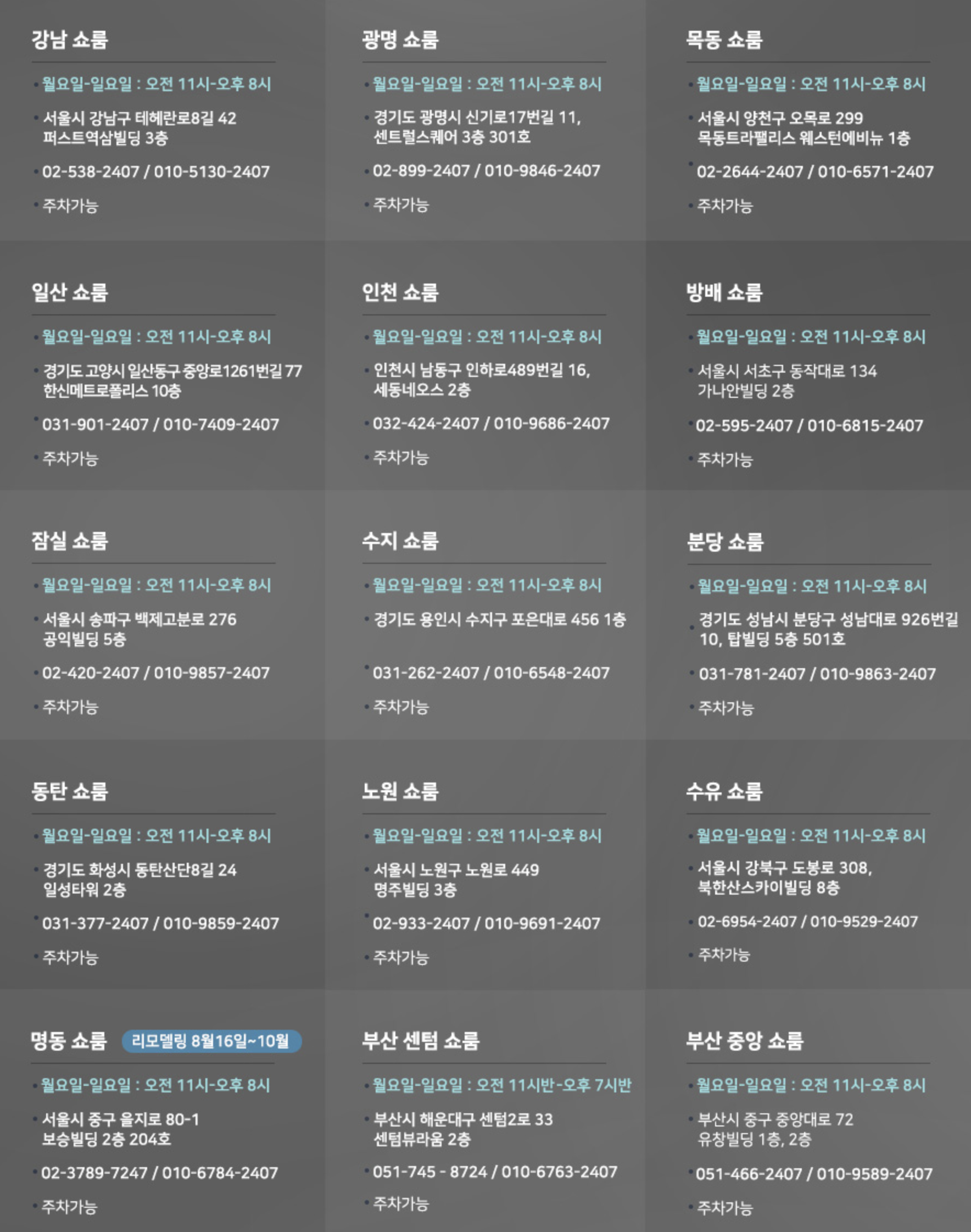 모든 쇼름은 직영점으로 운영중이고 사전 예약제로 운영되고 있으니 방문전 예약이 필요하다.